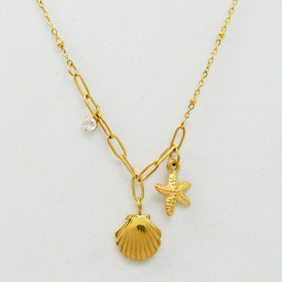 Channel summer all year round with our Sunkissed Vibes Necklace, featuring a delicate gold chain adorned with a shimmering crystal, a cute starfish, and a classic shell charm. Whether you’re heading to the beach or just bringing the beachy vibes to brunch, this necklace adds the perfect golden glow to any outfit. 🌞🌊